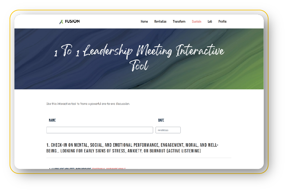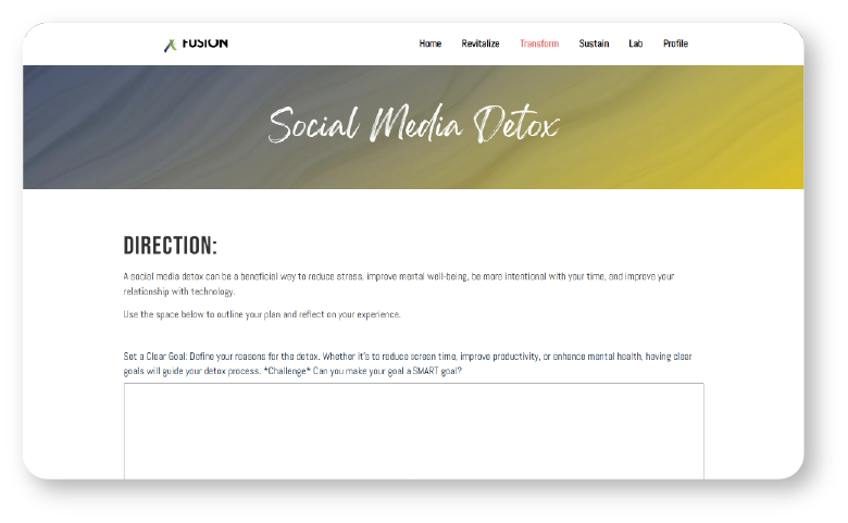 FUSION is human-centered, performance and development software that combines evidence-based best practices from business, wellness, and psychology to help users reach their full potential and to create real, lasting change.